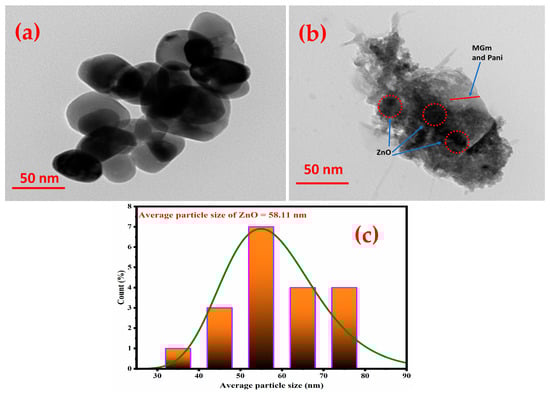 The morphology of pristine ZnO and ZM-g-Pani bionanocomposites was also recorded by the TEM technique, presented in Figure 3. The TEM micrograph in Figure 3a shows ZnO NPs of almost spherical shape (dark regions) embedded on MGm/Pani copolymer (grey region). Based on the estimated data using ImageJ software (version 1.53t), the ZnO particle size distribution (PSD) is shown in histogram (Figure 3c). The ZnO average particle size was estimated about 58.11 nm. Figure 3b presents morphological evidence of ZM-g-Pani bionanocomposites. It is revealed that the MGm and Pani polymers are strongly adhered to each other, forming flat layered structure (in grey color), hence proving to be functionalized. In addition, ZnO particles are found to be spread all over the surface of ZM-g-Pani bionanocomposites. While ZnO is highly clustered at some places (encircled with red dotted circle) over the exterior surface of ZM-g-Pani which is also evident by FE-SEM study. Thus, this study confirms successful formulation of ZM-g-Pani bionanocomposites.