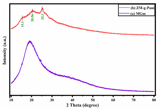 The X-ray diffraction (XRD) patterns of purified MGm and ZM-g-Pani composites are presented in Figure 4. The purified MGm shows a broad peak within a range of a 10–30° 2θ value, confirming its amorphous nature [46] (Figure 4a). Figure 4b indicates the semicrystalline nature of ZM-g-Pani composites, having few sharp peaks, with the intensity lying within the parenthesis, at 2θ values of 15.1°, 20.56°, and 25.3°. The peak at 2θ = 25.3° is observed for the pure Pani chain. This peak is assigned to the periodicity parallel to the Pani chain [47]. A small hump at 2θ = 15.1° confirms that the Pani in the composite is in an emeraldine form [33,48]. The 2θ = 20.56° in Figure 4b with diminished intensity represents the presence of MGm in the as prepared ZM-g-Pani composites. Noticeably, the ZnO peak becomes insignificant in the XRD pattern of ZM-g-Pani composite (Figure 4b). This phenomenon was also observed by Deb et al. [49]. They explained that the dense coating of Pani on the ZnO nanoparticles made the peaks of ZnO negligible in the composite.
