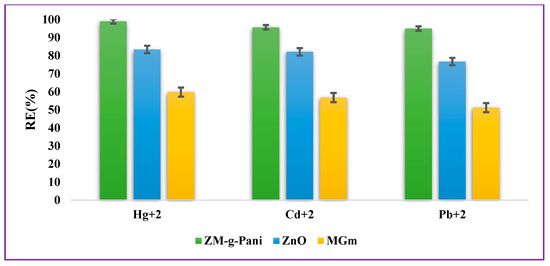 For comparative studies, the efficacy of pristine ZnO, pristine MGm, and ZM-g-Pani nanocomposites towards Cd2+, Pb2+, and Hg2+ removal has been investigated in an aqueous neutral media (Figure 5). For this, 0.015 g of adsorbent material was added in separate beakers containing 40 mg/L of Cd2+, Pb2+, and Hg2+ ions, agitated using shaker at 400 rpm at 25 ± 3 °C for 24 h. After the completion of the sorption process, the RE(%) of each adsorbent materials were calculated using Equation (1). The trend of the RE(%) of adsorbent materials towards chosen metal ions was recorded as follows: ZM-g-Pani > ZnO > MGm. The RE(%) of the ZM-g-Pani nanocomposite is more because of the occurrence of active functional groups, such as carboxyl, hydroxyl, amines, imines, and thiol groups, as well as a more active surface area in comparison with pristine ZnO NPs and pristine MGm.
