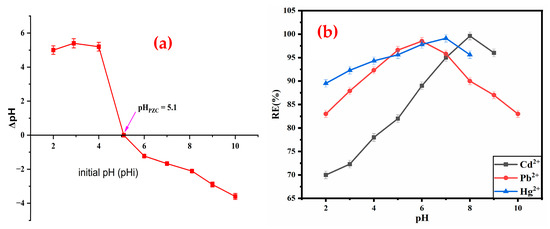 (a) Zero-point charge of ZM-g-Pani nanocomposites at different pH values, and (b) effect of pH for the adsorption of Cd2+, Pb2+, and Hg2+ ion from aqueous solutions.