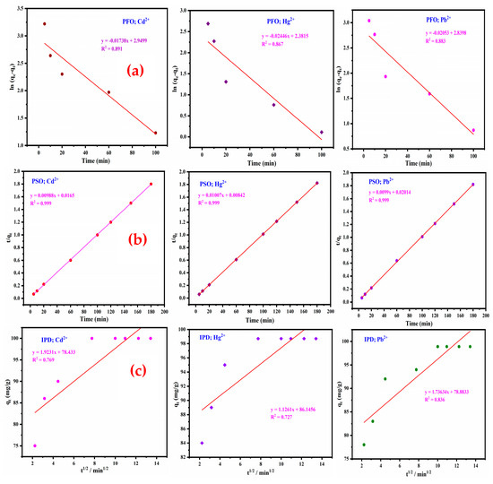 Pseudo-first order kinetics (a), Pseudo-second order kinetics (b), and intraparticle diffusion (c) linear fitting for the adsorption of Cd2+, Hg2+, and Pb2+ on ZM-g-Pani nanocomposites.