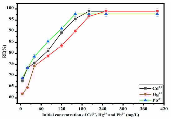 The impact of the initial concentrations of Cd2+, Hg2+, and Pb2+ ions on the RE(%) of the ZM-g-Pani nanocomposite has been investigated within the range of 5.0–400 mg/L, with a pre-optimized pH and ZM-g-Pani dosage of 0.01 g for 120 min to achieve equilibrium at 25 ± 3 °C. As shown in Figure 9, the RE(%) for all three metal ions demonstrated a significant increase as the initial concentration was raised from 5 mg/L to 200 mg/L for Cd2+, 5 mg/L to 250 mg/L for Hg2+, and 5 mg/L to 160 mg/L for Pb2+. This behavior can be explained by the sufficiency of the active binding sites on the fixed adsorbent dosage. At lower concentrations, the metal ions in the solution occupy the binding sites efficiently, leading to a higher RE(%). However, at higher concentrations, saturation of the limited binding sites occurs, resulting in the presence of unadsorbed metal ions and a consequent decrease in RE(%).