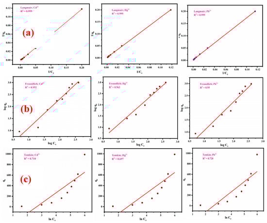Langmuir model (a), Freundlich model (b), and Temkin model (c) applied for the sequestration of Cd2+, Hg2+, and Pb2+ ions onto ZM-g-Pani nano-adsorbents.