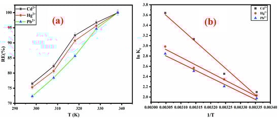 Adsorption runs were carried out at 298.15, 308.15, 318.15, 328.15, and 338.15 K for 120 min to find out the effect of temperature on the adsorption efficiency of Cd2+, Hg2+, and Pb2+ (40 mg/L each) on the ZM-g-Pani nanocomposites (0.01 g). The outcomes associated with different temperatures are illustrated in Table 3. As witnessed in Figure 11a, an increase in the temperature has led to an increase in the RE(%) of Cd2+, Hg2+, and Pb2+. Therefore, Cd2+, Hg2+, and Pb2+ adsorption on the ZM-g-Pani nano-adsorbent is endothermic [4]. Polymer-based adsorbents have been found to yield comparable outcomes in the elimination of dicationic metal (M2+), as reported by several studies [4,59,60].