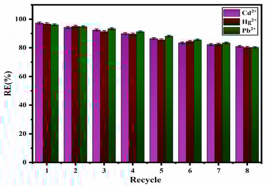 The regeneration of the nanocomposite is a crucial element in the removal process for saving energy and reducing costs. To address this, a specific amount of newly synthesized ZM-g-Pani is used in a continuous cycle of eight adsorption–desorption cycles. After each cycle, the adsorbate (Cd2+, Hg2+, and Pb2+) is extracted using 0.1 M HCl for 20 min. The results, as illustrated in Figure 12, demonstrate that RE(%) remained high at more than 85% for all the chosen metal ions after eight cycles without any substantial decline in removal efficiency. The impact of co-existing ions on the efficiency of adsorption has been evaluated separately for solutions containing 40 mg/L of Cd2+ at pH 8, 40 mg/L of Pb2+ at pH 6, and 40 mg/L of Hg2+ at pH 7. The solution also contains various ions, including NO3−, PO43−, SO42−, Cl−, Na+, Cu2+, and Al3+ at a concentration of 250 mg/L. The results of the removal study indicate that there are no substantial alterations in the uptake of the selected metal ions with ZM-g-Pani (R% = 85.53%) in the presence of the chosen anions and cations. However, the adsorption yield is lower compared to that of the wastewater (R% > 95%), which is due to the exhaustion of the functional sites of the ZM-g-Pani with external anions and cations. Additionally, there is close rivalry for adsorption between the co-existing Cd2+, Pb2+, and Hg2+ ions over the ZM-g-Pani, leading to a reduction in the adsorption yield.