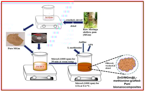 Firstly, 0.4 g of ZnO and 1 g of MGm were mixed in 100 mL of 2 M HCl solution in a 250 mL beaker and allowed to be agitated for half an hour. After that, 0.26 g of L-methionine was added, and the mixture was ultrasonically treated for one hour, subsequently, followed by the addition of aniline monomer. In another beaker, APS solution was prepared in 2 M HCl at 0 to 4 °C. After that, cooled APS solution was added dropwise in a beaker containing MGm and ZnO solution with continuous stirring for 10 h to initiate the in situ polymerization reaction. After the completion of the chain reaction, a green colored product, i.e., ZM-g-Pani nanocomposite, was obtained. Finally, the resultant green product was washed (with DDW, ethanol, and acetone), followed by drying in an oven at 70 °C overnight. Scheme 1 illustrates the preparation of the ZM-g-Pani bionanocomposites.