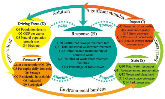 The DPSIR theory was introduced by the Organization for Economic Cooperation and Development (OECD) in 1993 and is based on the characteristics of the PSR model, which helps in understanding system concepts and providing potential solutions to current problems [35,36] The DPSIR theory is a framework for causality correlation indices, aimed at establishing a chain of causality in the form of driver–pressure–state–impact–response. The theory integrates social, economic, environmental, and public health domains to highlight the threats to the ecological security of water environments across various sectors. It also illustrates the positive and negative feedback from the environment to society as a result of human activities and their eventual impacts, using response indicators [37]. Its broad scope makes it the most suitable method for studying the ecology of water environments (Figure 2).