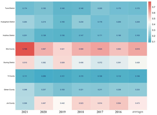 From a spatial interpretation perspective, over the six years, the relative proximity evaluation index and the coefficient of variation in the spatial analysis of the Huizhou region generally showed a trend of slow fluctuation followed by a rise. To visually display the spatial variability of the water environment’s ecological carrying capacity across the counties in the Huizhou region, a heatmap was used (Figure 4). The heatmap effectively highlights the differences between counties and helps identify trends and areas of high and low distribution. Especially when the normality or distribution type of the data is unclear, the heatmap can more intuitively reveal the patterns of spatial variability. The results show that in 2016, the development levels of ecological carrying capacity, ranked from highest to lowest, were as follows: Shexian County (0.563), Jixi County (0.554), Xiuning District (0.391), Qimen County (0.236), Huangshan District (0.200), Huizhou District (0.190), Tunxi District (0.174), and Yixian County (0.112). In 2021, the ecological carrying capacity development level from high to low was Shexian County (0.798), Xiuning District (0.510), Jixi County (0.306), Qimen County (0.298), Huangshan District (0.264), Huizhou District (0.201), Tunxi District (0.175), Yixian County (0.111). These indicators quantified and ranked the development levels of water environment ecological carrying capacity across the counties in the Huizhou region based on relative proximity values, reflecting the strengths and weaknesses of each county’s ecological carrying capacity. The spatial variability in the ecological carrying capacity of the water environment in the Huizhou region is evident, with Shexian County, Xiuning District, and Jixi County showing higher levels of development. The coefficient of variation indicates that the dispersion of the relative proximity evaluation index has decreased year by year, suggesting that the spatial gap in the ecological carrying capacity of the water environment in the Huizhou region is gradually narrowing.