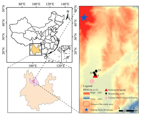 The Heilongtan Spring area is situated on the outskirts of the Hengduan Mountains in the western region of Yunnan Province (Figure 1). The Yulong Snow Mountain borders it to the north and the Jinsha River valley to the south. The area’s topography is higher in the north and lower in the south. The Heilongtan Spring area mainly encompasses the Gucheng District of Lijiang City and the Yulong Naxi Autonomous County. Mountainous basins and tectonic terrains characterize the geomorphology of the spring area. The Heilongtan Sprin is located in the Lijiang Dam District at the base of Xiangshan Mountain, north of Gucheng. It consists of five spring outcrops with an elevation of approximately 2400 m.