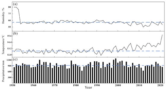 The extent of the study area. Changes in climate factors in the Lijiang area from 1951 to 2021 (in Figures (a–c), the blue dotted line represents the data mean): (a) annual-mean relative humidity; (b) annual-mean temperature; (c) annual precipitation.