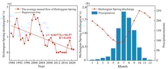 Characteristics of the discharge variation of Heilongtan Spring from 1988 to 2021: (a) interannual discharge variation; (b) intra-annual discharge variation.