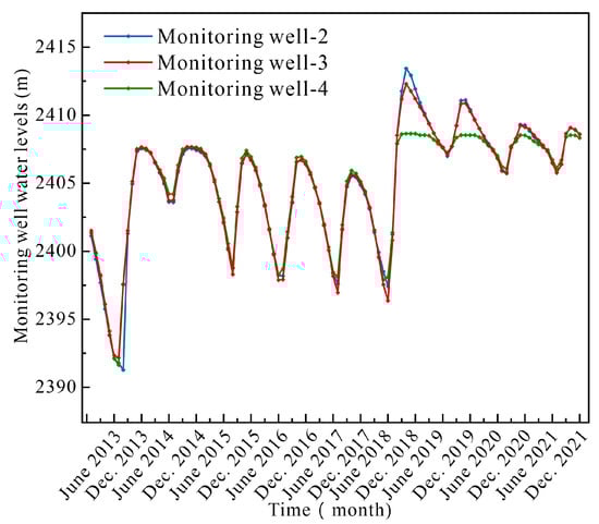 An analysis was conducted on the yearly fluctuations of groundwater levels in Heilongtan Spring from 2013 to 2021. The study focused on three specific monitoring sites, namely Heilongtan Spring No. 2, No. 3 and No. 4, as seen in Figure 4. Using statistical methods, an analysis was conducted on the water level (monthly scale) fluctuations of monitoring wells No. 2–3 at Heilongtan Spring from 2013 to 2021. The study revealed a consistent trend in the water level changes of these monitoring wells. During low peak groundwater levels, the water level in monitoring well No. 4 of Heilongtan Spring is higher than the other two wells. However, during high peak groundwater levels, the water level in monitoring well No. 4 is lower than that of monitoring wells No. 2 and No. 3. This difference is because the three monitoring wells are positioned based on surface elevation, with monitoring wells No. 2 and No. 3 being the highest and lowest, respectively, at Heilongtan Spring. The three monitoring wells are arranged in order of decreasing surface elevation. The No. 2 well of Heilongtan Spring has an elevation of 2446.24 m and a depth of 100.65 m. The No. 3 well has an elevation of 2412.96 m and a depth of 52.83 m. The No. 4 monitoring well has an elevation of 2408.84 m and a depth of 50.70 m.