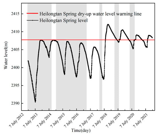 Dynamic changes in the water level of Heilongtan Spring from 2013 to 2021 (the shaded area represents the dry period).