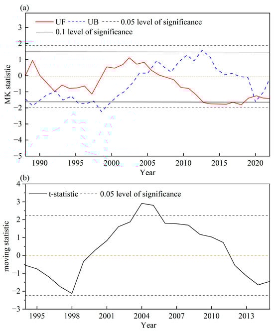 The moving t-test is employed to conduct a secondary test on the intersection of the UB and UF series to clarify the mutation point and its position further. Based on the data in Figure 6b, the sliding statistic surpasses the significance level of 0.05 throughout 2014–2015. When paired with the findings of the MK mutation test, it can be concluded that there is a mutation point in precipitation around the year 2005.