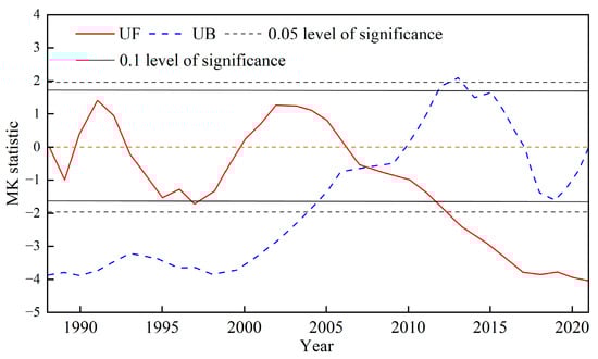 The Mann-Kendall (MK) mutation test is a non-parametric method for analyzing hydrological and meteorological time series data. It is widely recognized in this field []. Mutation in this context refers to transitioning from one stable state of data series to another. The MK mutation test is advantageous compared to other methods as it can eliminate the influence of outliers on the analysis results. Additionally, it does not require assumptions about the data distribution []. An ordered series can be established for analysis for a time series with n samples: