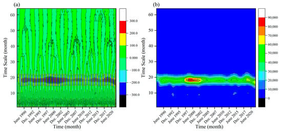 Wavelet analysis of monthly precipitation in Lijiang City: (a) accurate part contour map of Morlet wavelet coefficient; (b) modulus square contour map of Morlet wavelet coefficient.