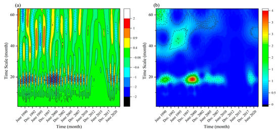 Currently, wavelet analysis is extensively employed in hydrology []. This method effectively handles information in the localized transformation signals of time-frequency. Consequently, wavelet analysis is commonly utilized to investigate the periodic patterns of temperature, precipitation, runoff, and their corresponding dynamics across various time scales []. Wavelet analysis encompasses both Continuous Wavelet Transform (CWT) and Discrete Wavelet Transform (DWT). Continuous Wavelet Transform (CWT) denotes a signal processing method wherein both time and time-shift parameters are continuous. This method is frequently employed in applications that necessitate continuous scale analysis. The Discrete Wavelet Transform (DWT) is a signal processing method that employs discrete time and time-shift parameters. It is frequently utilized in applications that necessitate multi-resolution analysis. In comparison to the discrete transform, the continuous transform is more conducive to the extraction of time-series features. Consequently, the continuous wavelet transform is frequently selected for use in time-series analysis []. CWT is defined as:
