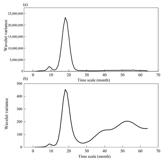 To validate the accuracy of the wavelet transformation analysis results for the discharge rate of Heilongtan Spring and the precipitation in Lijiang City, a wavelet variance test was conducted on the monthly average discharge rate of Heilongtan Spring and the monthly precipitation in Lijiang City. The results are presented in Figure 10. The main cycle of precipitation in Lijiang City occurs every 18 months. Additionally, there is a secondary cycle with a peak around October. However, it is less noticeable com-pared to the primary cycle. Based on the analysis of Figure 10, it can be observed that the discharge of the Heilongtan Spring exhibits characteristics of multiple time scales. Four distinct peaks correspond to 10, 18, 40 and 55 months of oscillation cycles. The 18 month cycle is the most prominent and primary cycle among these cycles. This cycle aligns with the Heilongtan Spring discharge and the precipitation in Lijiang City, as indicated by the wavelet’s natural part, mode square, and other linear plots.