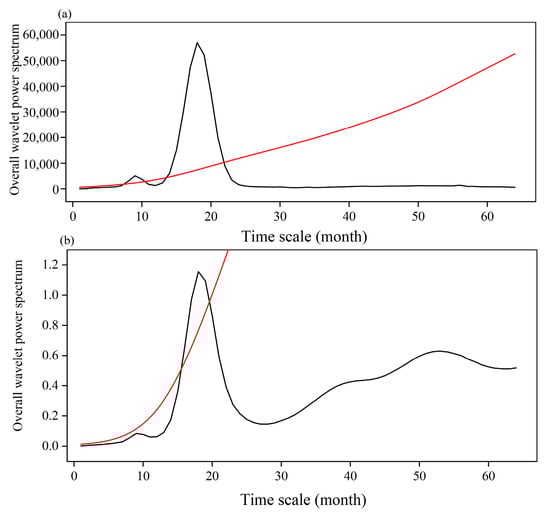 Overall wavelet power spectrum: (a) Lijiang Precipitation; (b) Heilongtan Spring discharge.