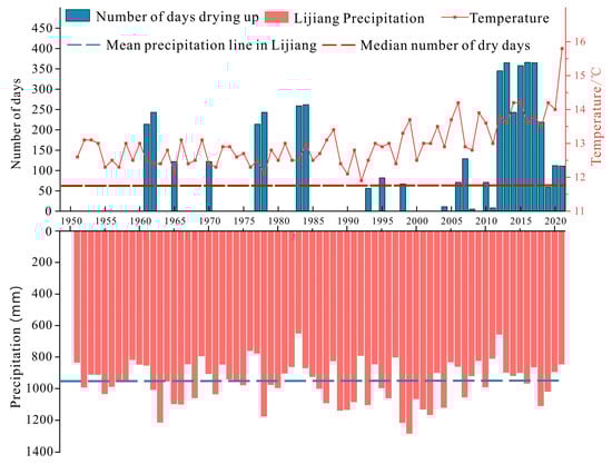 The region is abundant in water resources, with a surface water system that includes significant rivers such as the Heibaishui River, Culture River and Yanggong River, all of which are part of the Jinsha River water system. Additionally, several exposed springs are in the area, including Qingxi Spring, Heilongtan Spring, Shuhe Spring, and Shuangbao Spring. The spring area is in the warm-temperate plateau mountain monsoon climate zone, characterized by a combination of dry and wet conditions throughout the year. The mean annual precipitation over several years is 954.2 mm, with the most excellent inter-annual temperature recorded at 15.8 °C and the lowest at 12.1 °C. The mean temperature across the years is 13.0 °C, while the mean relative humidity is 63.3%, as depicted in Figure 2. The distribution of precipitation throughout the year is unequal, with the majority occurring from June to September. During this period, there is a significant amount of rainfall, which makes up about 85% of the total annual precipitation. The predominant groundwater in the Heilongtan Spring Area is Triassic limestone fissure karst water, which is also the type of groundwater in the Heilongtan Spring area. This spring exhibits typical characteristics of the rain-source type. In its natural state, the primary recharge region of Heilongtan Spring is predominantly the karst depression located to the north of Heilongtan Spring. This area is distributed throughout Jiuzihai, Lariguang, Hongshuitang, and other locations. The Lijiang Dam District is a well-developed karst region, where characterized by numerous sinkholes, caves and karst holes. The karst groundwater is mainly recharged by atmospheric precipitation, rapidly replenishing the karst aquifers by dissolving karst holes and sinkholes. The karst water is replenished by atmospheric precipitation in the karst highlands and then flows southward through the karst aquifer. Due to the pressure generated by the hydraulic head difference, the karst water converges and flows outward.