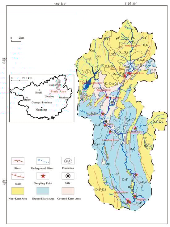 The Li River is a tributary of the Pearl River system located in the central part of Guilin City, Guangxi, China. Its watershed ranges from 24°38′10″–25°53′59″ N and 110°7′39″–110°42′57″ E, representing a typical karst region. The Li River originates from Ma’er Mountain in Yuecheng Ridge, flows southward, and ends at the Sanjiangkou in Pingle, with a total length of 164 km. The Li River watershed exhibits a narrow north–south elongated distribution, with a structural inclination and predominant Devonian and Carboniferous strata at the core of the syncline. The Li River’s main channel is primarily developed near the core of the syncline, which is also the region of concentrated distribution of carbonate rocks.