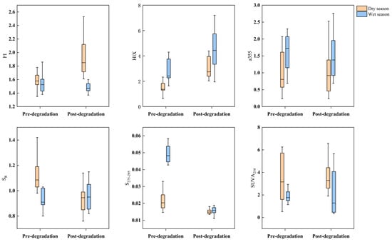 During the transformation process from Auto-DOC to Auto-RDOC, FI values indicated a shift from a mixed source to a microbial source during the dry season, while samples during the rainy season showed a more pronounced change towards a terrestrial source (Figure 2). The decrease in a355 revealed that microorganisms had consumed some CDOM during the Auto-DOC to Auto-RDOC process. HIX values showed an increase in the degree of organic matter humification and an enhancement of organic matter stability in the water samples. The decrease in S275–295 indicated an increase in relative molecular weight, consistent with results indicating an increase in the degree of humification, as indicated by the HIX. The slight increase in SUVA254 suggested a slight increase in aromaticity.