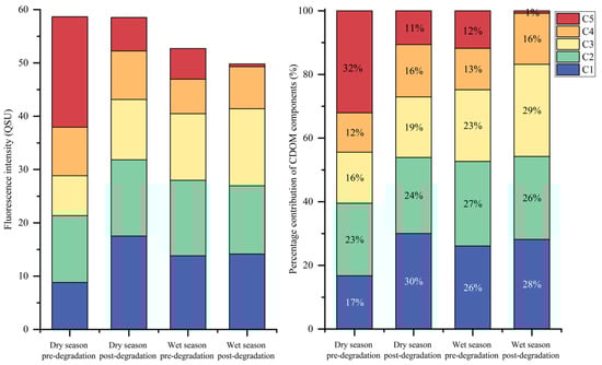During the Auto-DOC to Auto-RDOC transformation process, the total fluorescence intensity changed from 58.67 ± 20.92 QSU to 58.54 ± 21.01 QSU in the dry season (p < 0.05) and decreased from 52.70 ± 29.32 QSU to 49.81 ± 29.91 QSU in the wet season (p < 0.01) (Figure 3). There was no significant variation in total fluorescence intensity during the dry season, but a slight decrease in the wet season, which indicated that the organic matter was consumed thoroughly in the wet season.