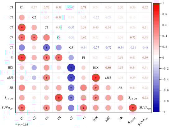 During the Auto-DOC to Auto-RDOC transformation process, variation in fluorescence components also leads to an overall alteration in the optical properties of CDOM. The relative molecular weight and humification degree increased; the S275–295 index decreased by 49% and the HIX increased by 89.75%. Because of higher Auto-DOC and labile DOC proportions in the dry season, the humification and aromatization degrees of DOC were lower than in the wet season. However, with the high utilization of labile DOC in the dry season, the variation in humification and aromatization degrees revealed a significantly higher increase in the dry season than in the wet season. The increase in the HIX in the dry season was 2.1 times that of the wet season, and the increase in SUVA254 was 1.5 times greater. A significant negative correlation between the C5 component and the HIX indicates (p < 0.05) that the increase in humification primarily resulted from the substantial consumption of low-humified labile DOC [34] (Figure 4). The significant positive correlation between components C1, C3, and the SUVA254 index (p < 0.05) suggested that the accumulation of Auto-DOC triggered an increased aromaticity level in the karst aquatic system. The labile DOC was rapidly decomposed in the karst aquatic system, while allochthonous DOC remained a sustained input, which led to a decrease in microbial-derived organic matter [35]. As a result, CDOM spectrum characteristics revealed a variation in which autochthonous indexes FI and SR were negatively correlated with autochthonous components (Figure 4).