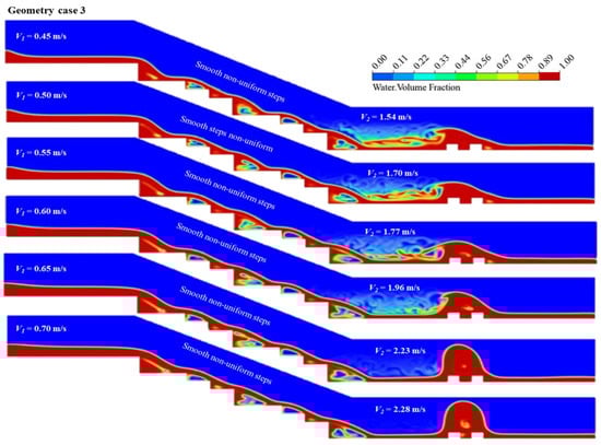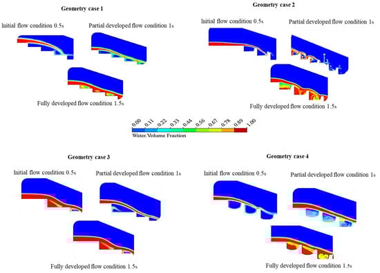 Figure 4 shows different flow regimes under different geometry configurations at various time steps. The initial flow conditions are significantly affected by aeration and high flow velocity. Free surface aeration is closely related to the flow patterns and surface velocity. As air concentration increases upstream, it interacts with the turbulent boundary layer. The effects of aeration and high flow velocity are particularly evident in the downstream flow properties of the air–water mixture, especially in scenarios with high Froude numbers. In these cases, the initial conditions notably influence the void fraction and air entrainment flux. Once the flow develops, the flow conditions change to different states.