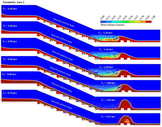 The results for case 1 numerical simulation is illustrated in Figure 5 and summarized in Table 4 for various flow rates. The study evaluates the flow dynamics and regimes across various flow conditions. Initial velocities were varied from 0.45 to 0.70 m/s, with increments of 0.5 m/s. The impact of aeration on pressure and velocity was observed, leading to distinct flow patterns downstream of the spillway. We examined several hydraulic parameters, including downstream velocities, critical depths, sequent depths, and upstream and downstream Froude numbers, documented in Table 4. The findings indicate that an increase in initial velocity generally leads to a corresponding rise in outlet velocity, consistent with momentum and energy conservation principles. Notably, when the Froude number is leading, the flow exhibits heightened sensitivity to velocity changes. The flow variation in the stepped channel is relatively consistent; however, a strong hydraulic jump is observed downstream at flow rates of 0.65 and 0.70 m/s. Moreover, the study of supercritical flow conditions revealed that flow depth and velocity variations can induce turbulence, complicating the flow dynamics.
