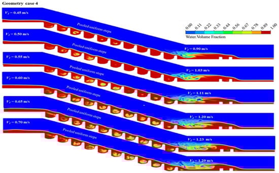 The pooled stepped configuration in case 4, features like U-shaped steps, was evaluated with the goal of maximizing energy dissipation at each step. It was observed from Figure 8 that this configuration was significantly affected by cavitation and recirculation, particularly with a higher number of steps. Changes in geometry altered the flow pattern and behaviors with varying velocities, influenced by the flow regime, which proved helpful in energy dissipation. The downstream velocity and Froude number for case 4 were recorded at 1.30 m/s and 2.423, respectively, at an inlet velocity of 0.70 m/s, as shown in Figure 8 and Table 7. These values are notably lower than those observed in Case 1, Case 2, and Case 3. Additionally, the critical and sequent depths and the Froude number showed minimal increases and no significant changes compared to case 2. The U-shaped steps in case 4 provided better results regarding ideal hydraulic jump, velocity, and Froude number compared to the other configurations; however, further improvements are needed to enhance the flow pattern and mitigate cavitation and recirculation for structure erosion.