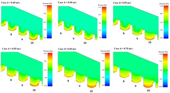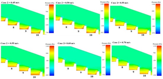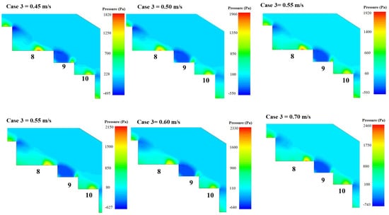 Investigating pressure contours on flat and pooled stepped spillways across various velocities and geometries provides crucial insights into structural integrity and potential cavitation risks. Understanding these pressure dynamics is essential for structural design and predicting areas of high stress that could lead to structural failure or damage under high pressure. Several pressure measurements were taken over the stepped spillway for all configurations. In case 1, higher pressure levels were observed at the eight, nine, and ten steps at lower velocities (0.45 to 0.55 m/s). In contrast, the highest negative pressures were recorded on the inner vertical faces of the flat stepped spillway at higher velocities (0.60 to 0.70 m/s). The pressure contours for flat steps indicate that pressure decreases as velocity increases, as observed in Figure 9. The upper half of the vertical face experienced negative pressure, while the horizontal face of the step was largely free of negative pressure, except for small fluctuations. These observations suggest that lower velocities may lead to increased pressure, but higher velocities significantly raise the risk of cavitation, particularly on the upper vertical inner faces of the step walls in flat stepped spillways. The presence of negative pressures indicates potential structural vulnerabilities, underscoring the need for careful design considerations in stepped spillway construction to mitigate cavitation risks and ensure structural safety under varying hydraulic conditions.