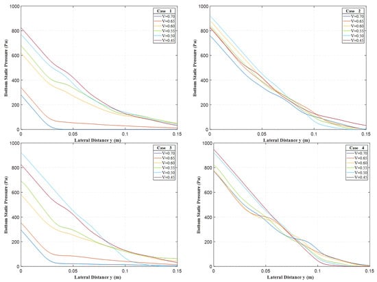 Pressure distribution downstream of spillway for geometry configurations case 1, case 2, case 3, and case 4.