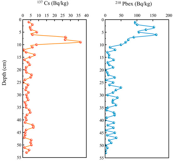 Vertical distribution of 137 Cs (Bq/kg) and 210 Pbex (Bq/kg) in the sediment.