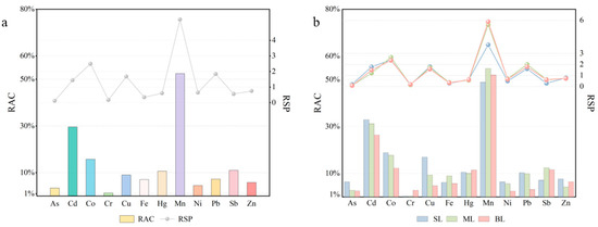 In summary, Cr (1.29%), As (3.44%), Ni (4.51%), Zn (5.84%), Fe (7.09%), Pb (7.28%), and Cu (9.04%) pose low RAC risks. Conversely, Hg (10.68%), Sb (11.02%), Co (15.76%), and Cd (29.62%) exhibit medium RAC risks. Mn stands out with the highest RAC value exceeding 50%, indicating a very high ecological risk (Figure 5a).