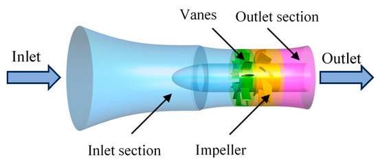 To balance large flow rates and high efficiency, axial-flow impellers are widely used in pumps and turbines [1,2] and are indispensable key equipment in the modern energy field [3,4]. With the development of technology, the application of axial-flow turbomachine units is increasing. The continuous occurrence of various accidents during the operation of axial-flow units has attracted people’s attention to the safe operation of the units [5,6]. Studying the performance and operating characteristics of axial-flow units under different operating conditions is of great practical significance for ensuring the efficient and safe operation of the units. In order to ensure the safe and stable operation of the unit, domestic and foreign scholars have conducted in-depth research on the effects of impeller diameter [7], blade angle [8], guide vanes [9], flow rate [10], and impeller speed [11] on the internal flow and pressure pulsation of the unit.