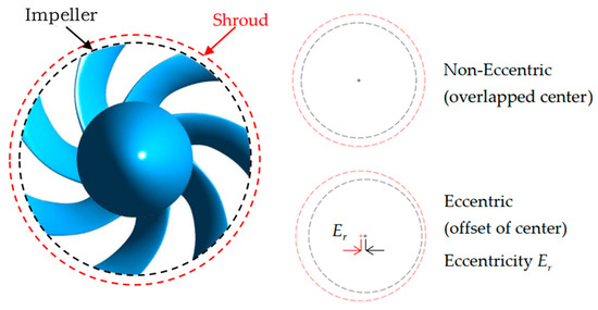 When the axial-flow impeller is operating, there is a certain degree of eccentricity because of cavitation erosion, wear, and other reasons, resulting in non-uniform circumferential tip clearance [24]. The non-uniform circumferential tip leakage can affect the flow field stability within the tip gap, causing leakage to exhibit unstable features, thereby inducing strong fluctuations of pressure, inducing vibration, noise, and fatigue damage, which has adverse effects on the system’s secure and stable operation [25,26]. In addition, uneven circumferential distribution of blade tip clearance can also lead to uneven circumferential pressure distribution and unequal load on each blade, causing the impeller to be influenced by additional radial force, which will cause self-excitation of the impeller [27]. Scholars researched the impeller eccentricity issue. Ehrich et al. [28] pointed out that under non-uniform tip clearance, the operating efficiency and load of blades located at different gap widths are different. Blades mounted with smaller gaps have higher operating efficiency and load; the blades with larger gaps show the opposite performance trend. Chen et al. [29] conducted steady and unsteady calculations on fans with different gap widths, and the results showed that the uneven tip clearance had a significant impact on the amplitude of pressure pulsation caused by tip leakage vortices.