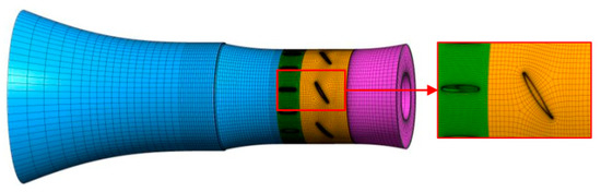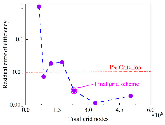 Meshing is the committed step of computational fluid dynamics (CFD). Meshing has an important impact on the accuracy and speed of numerical simulation results. The commonly used grid generation methods are based on structured grid and unstructured grid solutions [38]. Given the benefits of excellent grid quality as enhanced calculation precision and reduced element count, the choice is made to employ a hexahedral structured grid for domain discretization. In this study, the residual efficiency error serves as the metric for grid number assessment. Grid independence evaluations are performed using various grid schemes, with a residual efficiency error below 1% as the benchmark criterion. Figure 3 schematically represents the grid independence assessment. From the figure, it can be seen that when the total grid node count exceeds 2.3 × 106, the remaining error remains less than 1%. A scheme with 2.3 × 106 grid nodes was selected for grid division to balance accuracy and cost; the grid with its parts in different colors is shown in Figure 4 and Table 2. For a better adaptability of the DES model, the y+ value near wall is controlled to smaller than 3, which is an empirically good solution.