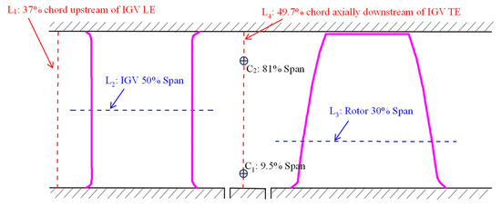 This article mainly adopts the method of numerical simulation for research. In order to validate the accuracy of the numerical simulation, a comparison was conducted between the outcomes of the numerical simulation and the experimental results under design conditions. The experimental results were obtained from reference [39]. Figure 5 is a schematic diagram of each measurement position. L1 and L4 are two straight lines, with L1 located at 37% chord upstream of the leading edge (LE) of the inlet guide vane (IGV) and L4 located at 49.7% chord downstream of the trailing edge (TE) of the inlet guide vane. L2 and L3 are the cross-sections of the guide vanes and impeller blades, with L2 located at 50% span of the IGV and L3 at 30% span of the impeller blades. C1 and C2 are two circles, with C1 located at the 9.5% wingspan circumference on L4 and C2 located at the 81% wingspan circumference on L4. Subsequently, we compare the velocity and pressure outcomes from both experimental and numerical simulations at different measurement positions.