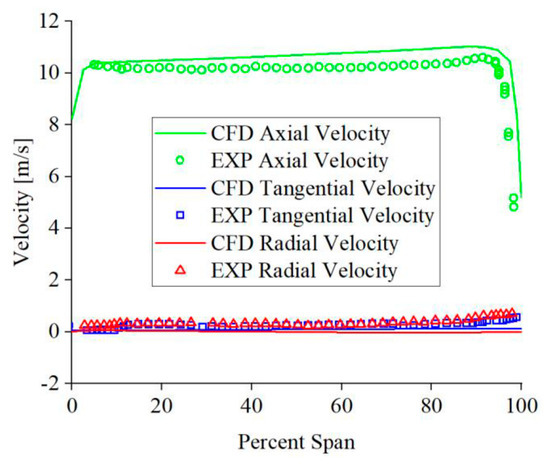 Figure 6 compares the results from the numerical simulation and experiment of the velocity on monitoring line L1. The figure clearly illustrates the velocity components in different directions on the monitoring line L1 obtained by numerical simulation are very close to the experimental results. The axial velocity on the monitoring line L1 is about 10 m/s, and the tangential velocity and radial velocity fall within 0.1~0.5 m/s.