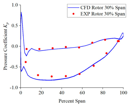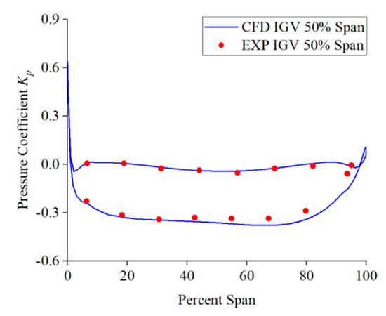 where p denotes the pressure at different points along the monitoring line, p∞ denotes the reference pressure at the inlet, and Utip represents the velocity at the impeller blade’s tip. Under design conditions, the impeller blades rotate at a rotation speed of 260 r/min, while Utip = 14.5 m/s. Figure 7 illustrates the contrast between the pressure coefficient Kp outcomes from numerical simulations and experimental data on monitoring line L2. Figure 8 illustrates the contrast between the pressure coefficient Kp outcomes from numerical simulations and experimental data on monitoring line L3. From the figure, it is evident that the pressure on monitoring lines L2 and L3 obtained from numerical simulation is basically consistent with the experimental results. The pressure coefficient of the blade pressure surface on monitoring line L2 is around 0, and the Kp of the suction surface is approximately −0.3. On monitoring line L3, the pressure coefficients of the blade’s pressure and suction surface gradually increase. In addition, the numerical simulation results reveal that the pressure at the leading edge of the guide vanes and impeller blades is relatively high, which is due to the heightened localized pressure induced by the fluid impact on the leading edge of the blades. Overall, numerical simulation has the capability to precisely forecast the pressure distribution on the blade surface, supplying a theoretical foundation for subsequent analysis.