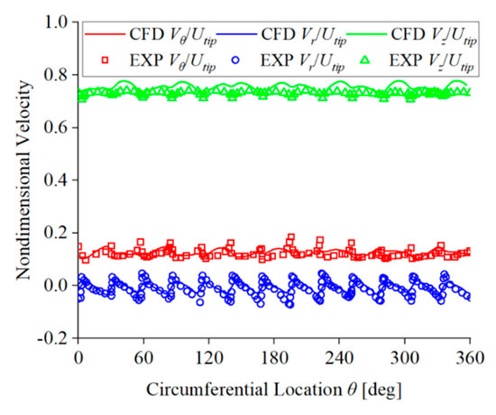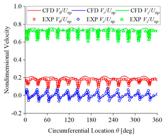 Figure 9 compares dimensionless velocity between the numerical simulation and experimental results on monitoring line C1. Figure 10 compares dimensionless velocity between the numerical simulation and experimental results on monitoring line C2. In these figures, Vr represents the circumferential velocity of the fluid, Vr represents the radial velocity of the fluid, and Vz represents the axial velocity of the fluid. From these figures, it can be seen that the dimensionless velocities on the monitoring lines C1 and C2 obtained from numerical simulation have the same fluctuation period and trend along the circumference as the experimental results, and the data are in good agreement. The range of velocity component fluctuation remains fairly constant at different positions. The preceding analysis demonstrates the accurate capability of numerical simulation in simulating velocity distribution within the impeller channel, and it is effective in analyzing the flow in the unit according to the numerical simulation results.