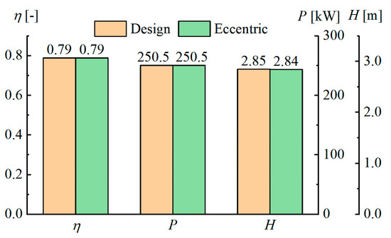To comprehend the impeller eccentricity influence on the unit performance, we compared the efficiency, power, and head of the unit under design conditions and eccentric conditions, as illustrated in Figure 11. From the figure, it is evident that under design conditions, the efficiency of the unit is about 80%, the power is about 251 kW, and the head is about 2.85 m. The impeller’s eccentricity has minimal effect on the unit’s performance, and compared to the reference operation with no eccentricity (design) conditions, the changes in efficiency, power, and head of the unit caused by eccentricity are less than 1%. It is clear that the impeller eccentricity does not affect the unit’s efficiency. However, it is necessary to explore whether the eccentricity of the impeller causes drawbacks and related hazards, such as vibration, noise, and cavitation, which may affect the unit’s safe operation.