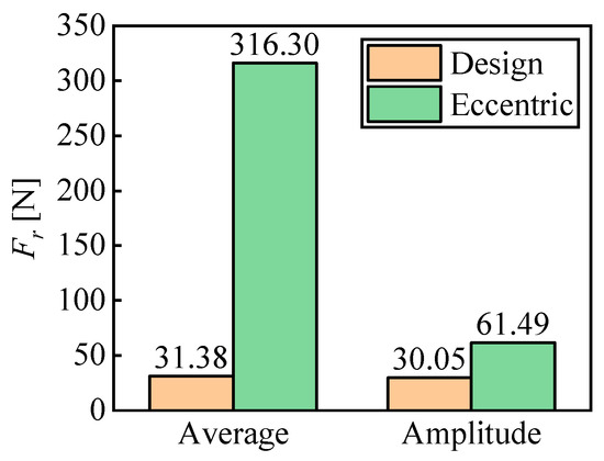Figure 12 displays the time domain plot of the radial force Fr of the impeller under two operating conditions during three impeller rotation cycles. From the figure, it can be observed that in both cases, the period of radial force pulsation is the same, the waveform is basically stable, and the amplitude (peak-peak value) change is small. The average of radial force and its amplitude of pulsation at eccentric conditions are significantly greater than those under design conditions. Figure 13 shows the average intensity value of radial force and its amplitude comparison on the impeller at two conditions. It illustrates the impeller eccentricity will cause a pronounced rise in the mean impeller radial force intensity, which poses a significant threat to the unit’s safe operation. Under design conditions, the mean radial force intensity of the impeller is 31.38 N, while under eccentric conditions, the mean radial force intensity of the impeller has increased by nine times, reaching 316.30 N. From the comparison of amplitude, it is evident that that the amplitude of the impeller under design conditions is 30.05 N, and the amplitude of Fr under eccentric conditions has increased by about one time, reaching 61.49 N.