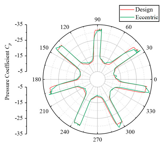 where p is the pressure at various points along the reference line. pin refers to the mean pressure at the inlet, while Vin refers to the average velocity at the same location. Figure 15 shows the changes in the pressure coefficient on the reference line under two conditions. It is evident from the figure that the pressure coefficient Cp on the reference line is between −5 and −35, and the pressure coefficient is less than zero. This indicates that the pressure at the tip clearance is lower than the average pressure at the inlet of the fluid domain, and cavitation and erosion are prone to occur at the tip clearance. Because of the effect of the impeller blades, the gap pressure distribution exhibits seven distinct cycles along the circumference. Under design conditions, the gap pressure distribution is basically the same across seven cycles. Under eccentric conditions, affected by uneven clearance, some blade passages have a higher pressure, while others have an opposite pressure, which results in certain differences in the distribution of clearance pressure in different blade passages. The uneven distribution of clearance pressure leads to a significant rise in the impeller’s radial force. In addition, the difference in pressure distribution between design and eccentric cases is mainly reflected in the variation of minimum pressure in the circumferential orientation, while the difference in maximum pressure in the circumferential orientation is not obvious.