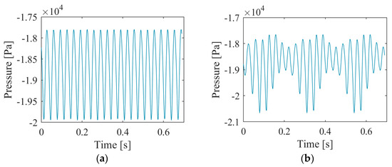 Time domain diagram of pressure pulsation at the monitoring point under different conditions. (a) Design condition; (b) eccentric condition.