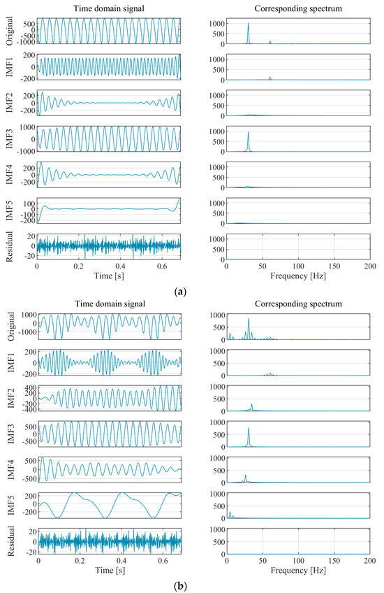 The IMF1 component has the highest frequency among all components, with a peak frequency of 60.67 Hz, which is twice the blade passing frequency fb. Under design conditions, the IMF1 frequency diagram component has only one peak. Under eccentric conditions, the IMF1 component is composed of multiple high-frequency and low-amplitude signals, and the frequency difference between each peak is still the impeller frequency fr, indicating that this component is jointly affected by fr and fb. Furthermore, notable distinctions emerge within the time domain graphs of the IMF1 component between the two conditions. Under design conditions, there are 21 identical periods in the IMF1 time domain, which is seven times the rotation period of the impeller. However, at eccentric conditions, there are only three periods, which are the same as the rotation period of the impeller.