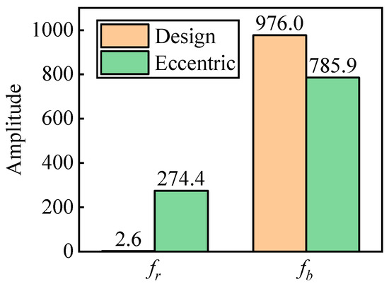 By analyzing the pulsation signal decomposed by VMD, it is found that the influence of impeller eccentricity on pressure fluctuation is mainly reflected in increasing impeller frequency on pressure fluctuation, which is consistent with the research results of Lu et al. [41]. Under design conditions, the dominant influence at the monitoring point is from fb. At eccentric conditions, the pressure pulsation at the monitoring point is jointly affected by fr and fb. Figure 18 compares the corresponding amplitudes of fr and fb under two conditions. It is evident from the figure that under design conditions, the corresponding amplitude of fr is 2.6, while under eccentric conditions, the corresponding amplitude of fr has increased by more than 100 times, reaching 274.4. Under design conditions, the corresponding amplitude of fb is 976, while under eccentric conditions, the corresponding amplitude of fb decreases to 785.9.