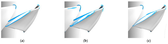 Comparison of blade tip vortices under different operating conditions. (a) Non-eccentric blade tip; (b) the biggest eccentric blade tip; (c) the smallest eccentric blade tip.