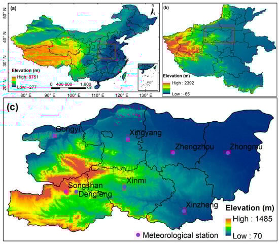 Geographical location of the study area: (a) China, (b) Henan, and (c) Zhengzhou.